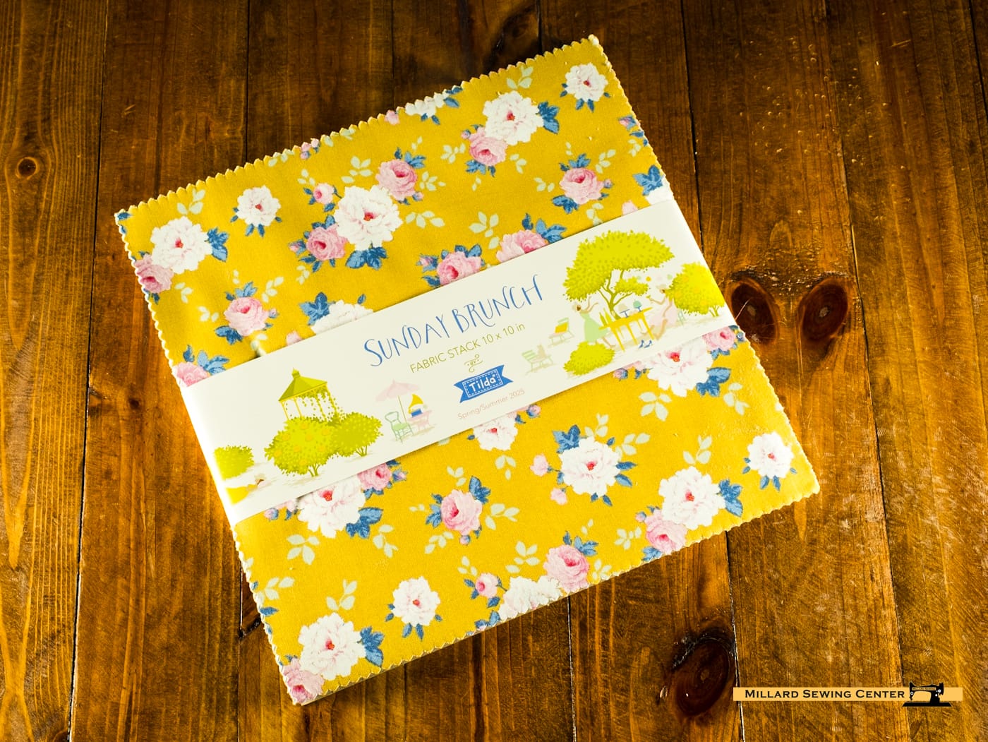 The Sunday Brunch Collection Fabric Stack includes 40 10in x 10in pieces of fabric- 2 of each of the main collection. Tilda Fabric’s Sunday Brunch, designed by Norwegian designer Tone Finnanger, is a softly colored vintage collection, where she has dusted off and renewed a few old romantic floral Tilda patterns. These are combined with a Sunday Brunch motif depicting friends sharing a lovely, laid-back brunch in the garden. The color palette is gentle but with a dash of sour for freshness, with colors ranging from teal, green, soft greys and yellows to ginger, pinks, blues and sand. The sweet Tipsy blenders complement the main collection perfectly.