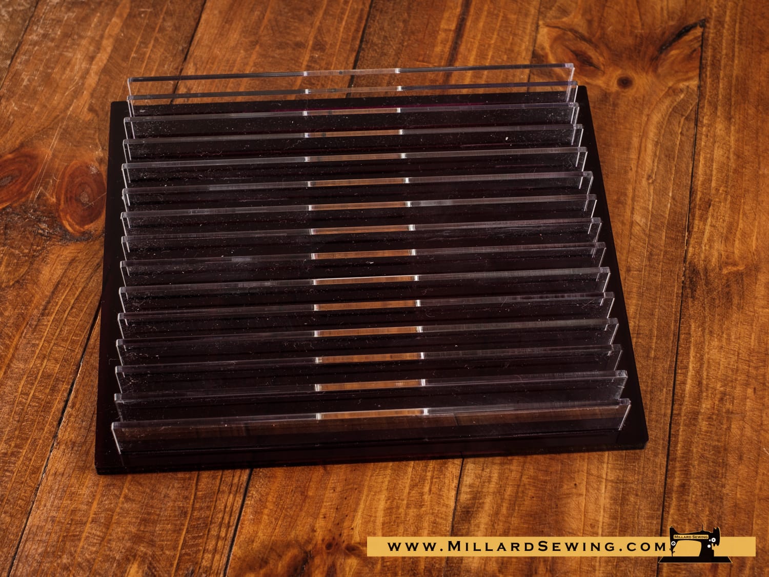 Minimum 10 rulers or templates capacity. The Rack comes with a colored acrylic base and clear separators.