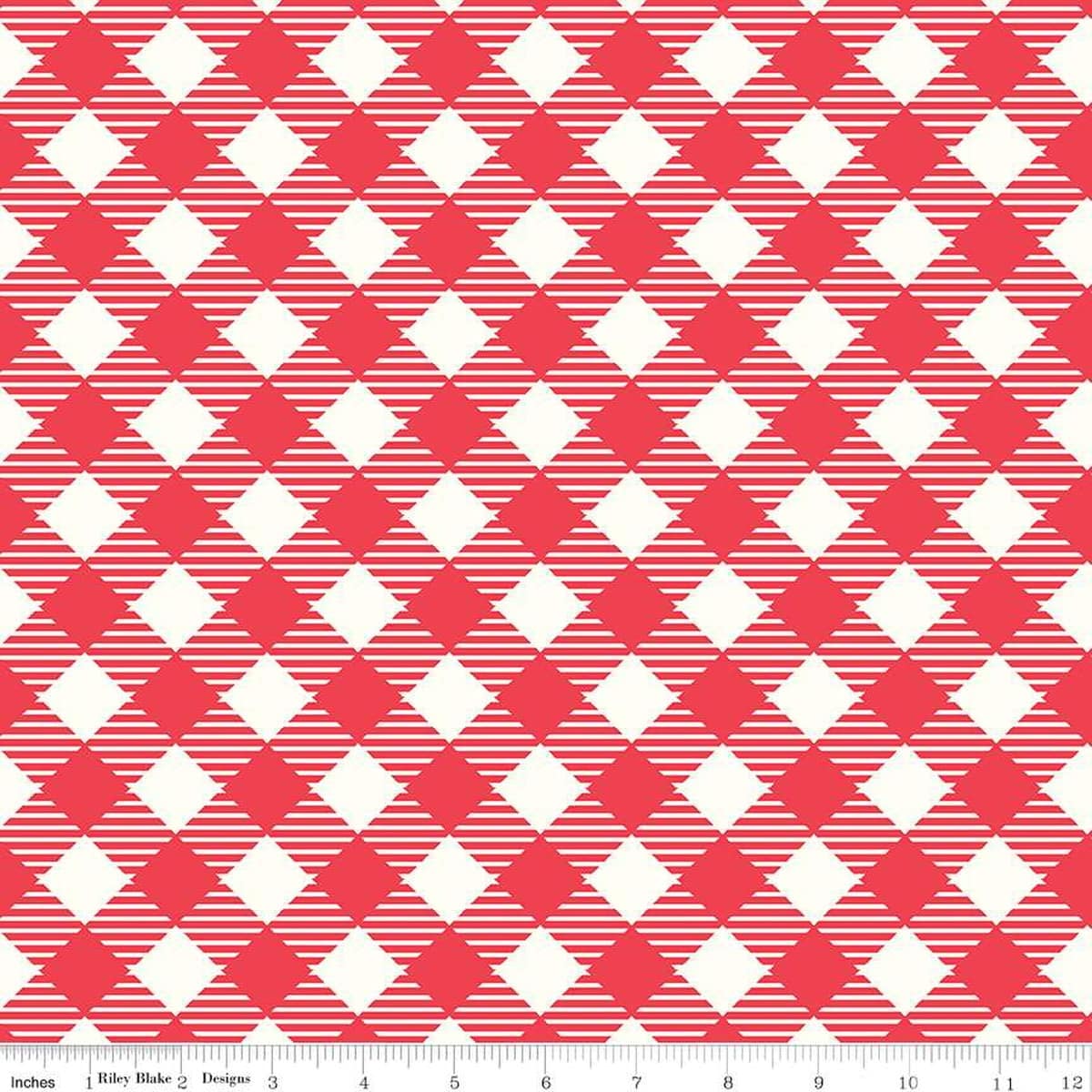 Bee Ginghams by Lori Holt of Bee in my Bonnet for Riley Blake Designs is great for quilting, apparel and home decor. This print features a 3/8″ diagonal, checked plaid with a striped square.