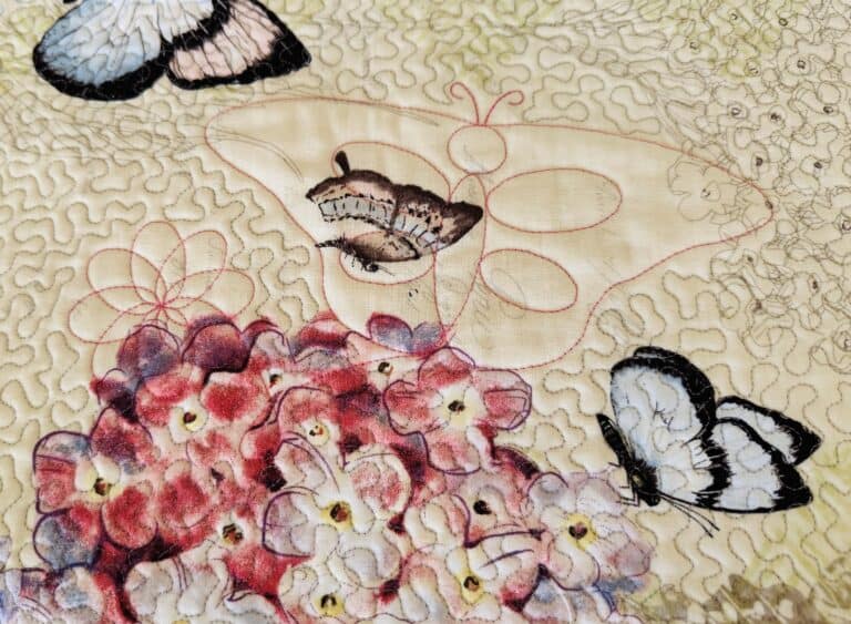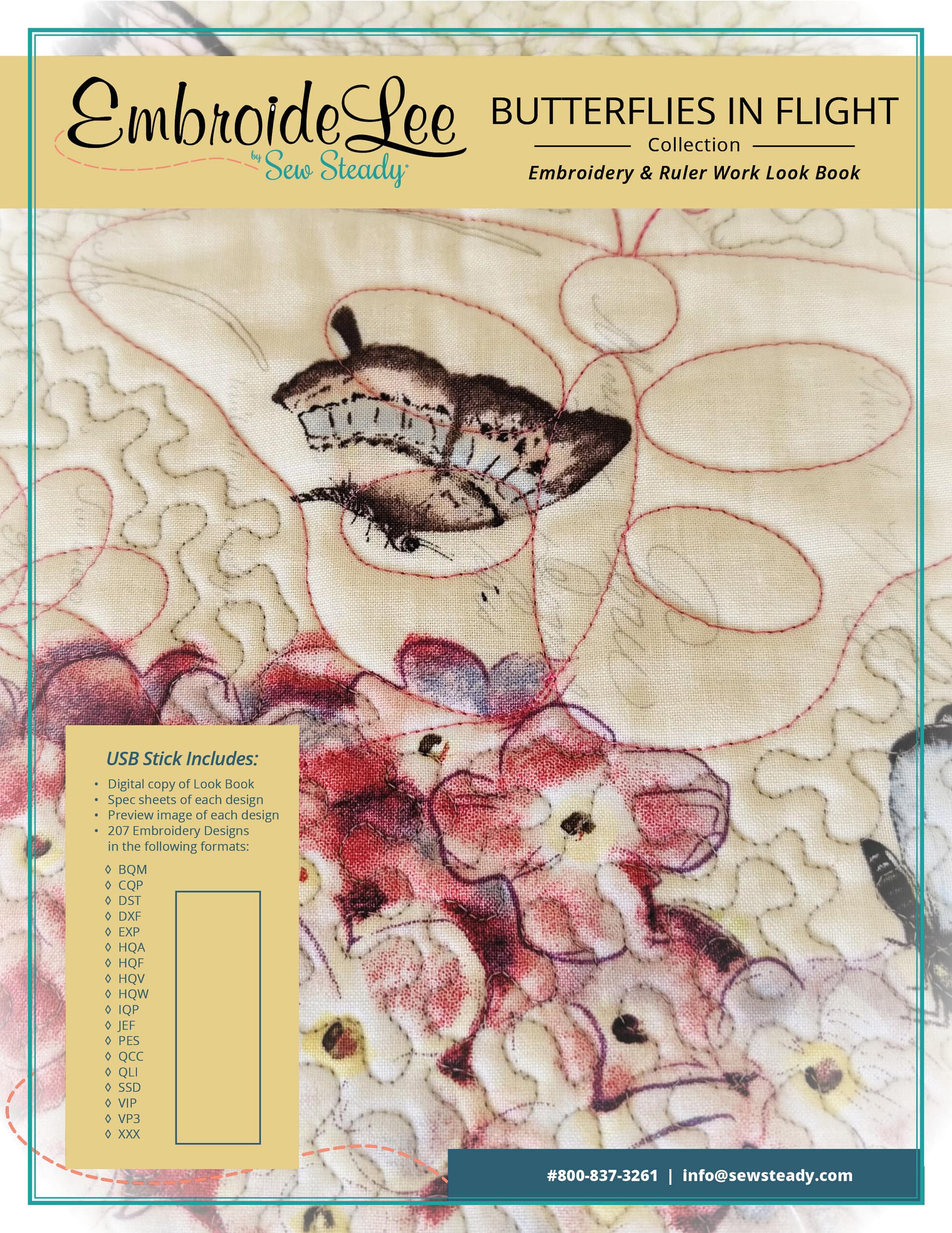 All of the embroidery designs found in our Butterflies in Flight Collection were crafted from the Butterflies in Flight, Spin-e-fex #7 and Wreath with Echo #16 series of ruler work Templates. Ruler work and embroidery work in tandem to create beautiful projects in a variety of sizes, which is why these Edge to Edge embroidery designs are sized to fit into 6” x 10, 8” x 12″, 10″ x 14″ and 11-1/2” x 16″ hoops. Designs are sent on a USB with a printed copy of the EmbroideLee Butterflies in Flight Collection Embroidery Look Book.