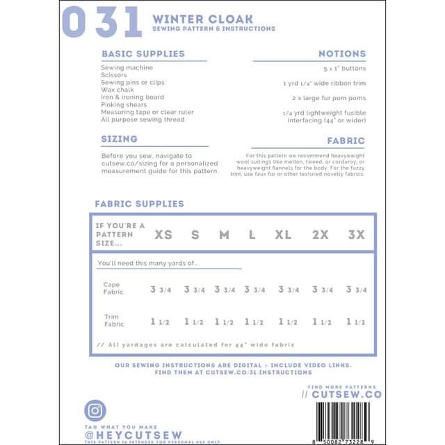 Winter is coming…and it’s cute as hell. This adorable cape sewing pattern has a larger, looser fit and features a button front closure, customizable trim on the hood & hem, and it wouldn’t be complete without bunny ears and decorative pom poms. A great project for absolute beginners, this is the pattern we recommend the most to customers looking for a quick & easy way to jump into sewing.