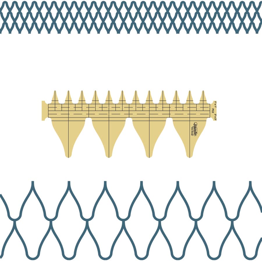 This ruler allows you to quilt a perfect Persian Clamshell pattern. 1″ x 3″ Points.