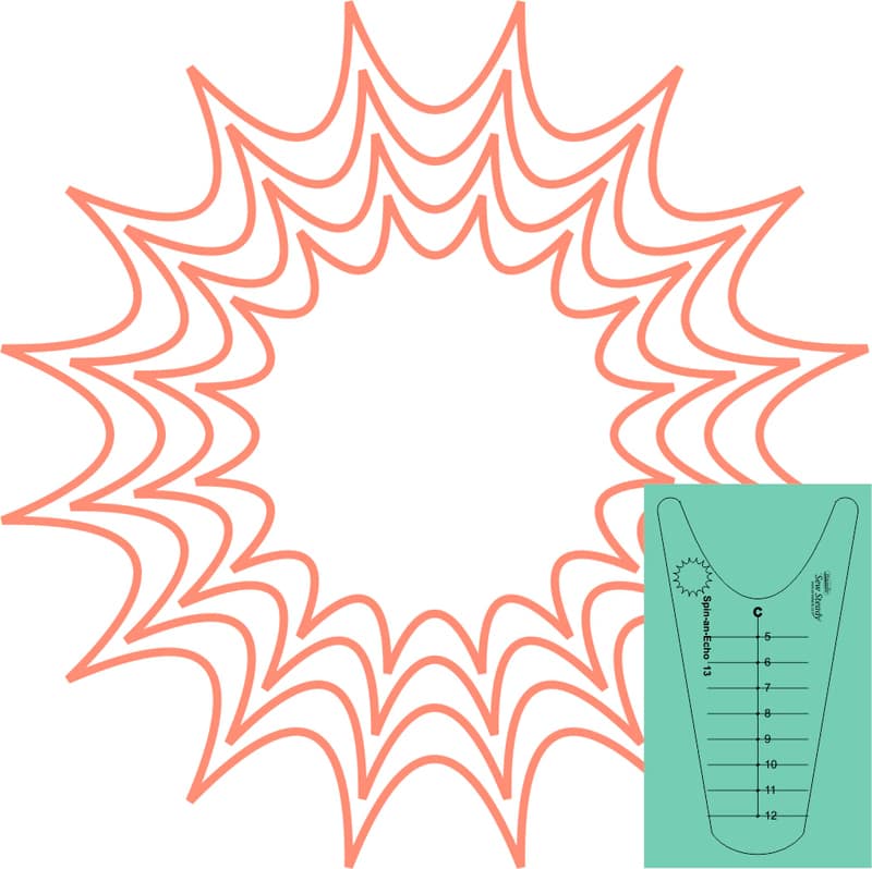 The Spin An Echo Templates will stitch up to 12โณ with different start points. Depending on the design you are looking for templates can start stitching at 2โณ. Spin An Echo Templates have been designed to be used with marked reference lines, using our Stitch and Rotate Quilting Method.The Spin An Echo Templates can be used with any of our Quilting Templates to create your own unique quilting designs.