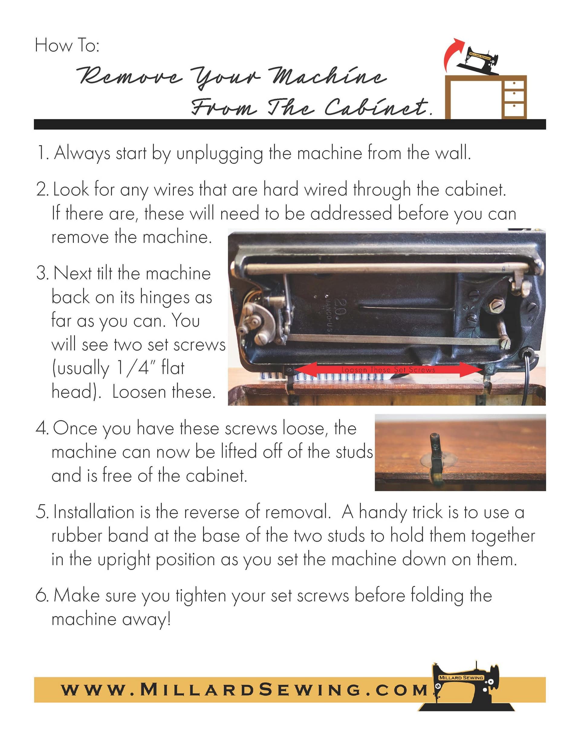- For non powered heads such as treadles, hand crank machines, and commercial machines which use a table mounted motor, this is not necessary. If your machine has been hard wired into a cabinet using a “block cord” that can be left in the cabinet.